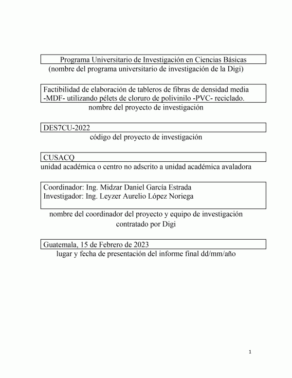 Factibilidad de elaboración de tableros de fibras de densidad media -MDF- utilizando pélets de cloruro de polivinilo -PVC- reciclado / Midzar Daniel García Estrada; investigador Leyzer Aurelio López Noriega.