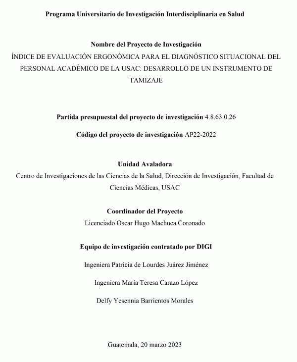 Índice de evaluación ergonómica para el diagnóstico situacional del personal académico de la USAC : desarrollo de un instrumento de tamizaje / Oscar Hugo Machuca Coronado; investigadores Patricia de Lourdes Juárez Jiménez, María Teresa Carazo López, Dorian Edilzar Ramírez Flores; Haylyn Karina Valdez de León; auxiliar de investigación II Barrientos Morales, Delfy Yesennia.