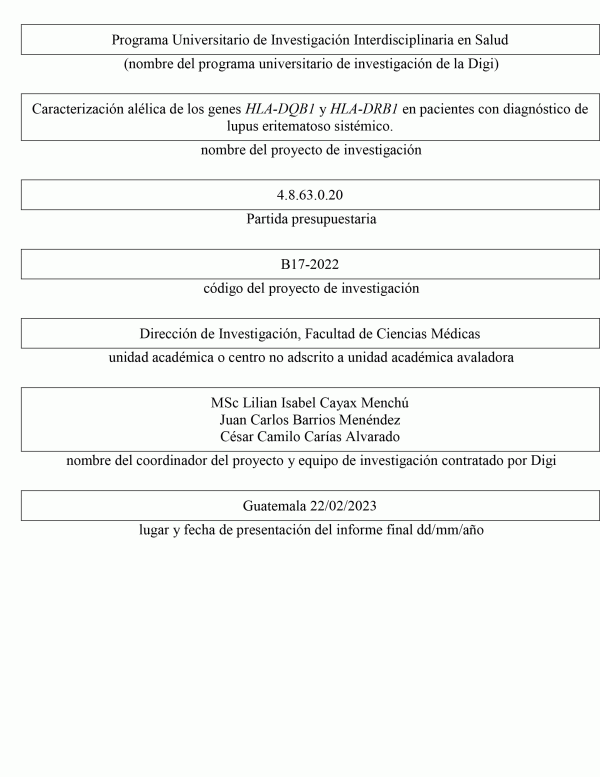 Caracterización alélica de los genes HLA-DQB1 y HLA-DRB1 en pacientes con diagnóstico de lupus eritematoso sistémico / Lilian Isabel Cayax Menchú; auxiliares de investigación Juan Carlos Barrios Menéndez y César Camilo Carías Alvarado; colaboradores Karla Odett Escobar Castro y Mynor Alberto Herrera Menéndez.