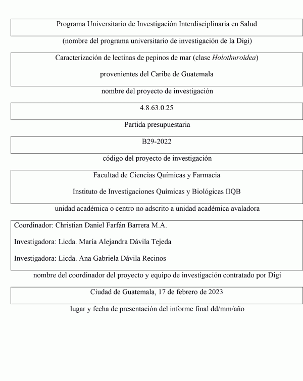 Caracterización de lectinas de pepinos de mar (clase Holothuroidea) provenientes del Caribe de Guatemala / Christian Daniel Farfán Barrera; investigadores Omar Ernesto Velásquez González, José Roberto Ortiz Aldana, María Alejandra Dávila Tejeda y Ana Gabriela Dávila Recinos.