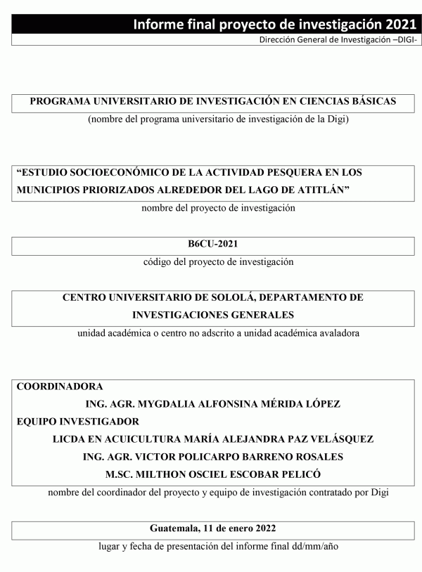 Estudio socioeconómico de la actividad pesquera en los municipios priorizados alrededor del Lago de Atitlán / Mygdalia Alfonsina Mérida López ; investigadores Victor Policarpo Barreno Rosales, María Alejandra Paz Velásquez y Milthon Osciel Escobar Pelicó.