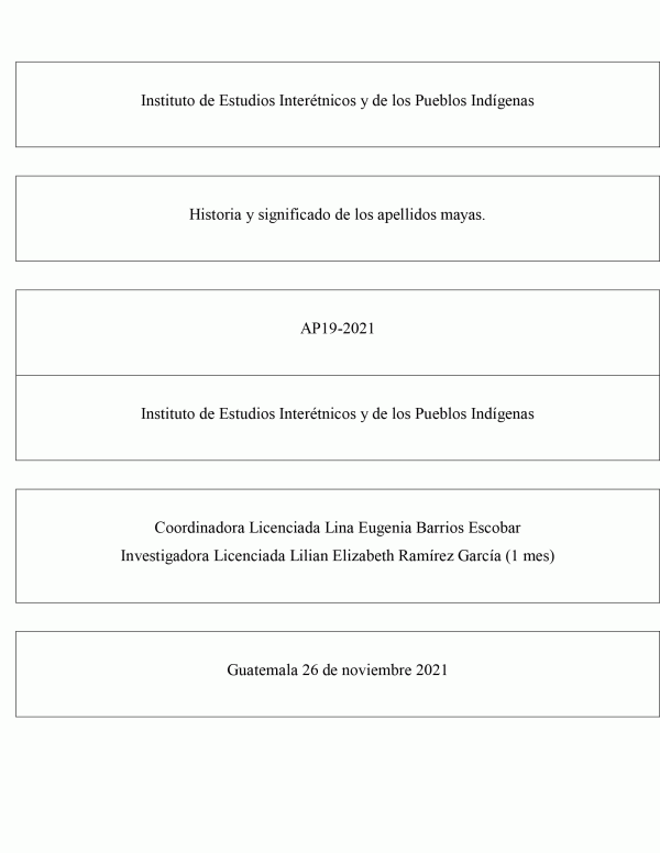 Historia y significado de los apellidos mayas / Lina Eugenia Barrios Escobar; investigadora Lilian Elizabeth Ramírez García.