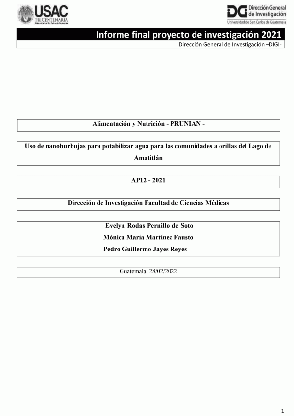 Uso de nanoburbujas para potabilizar agua para las comunidades a orillas del Lago de Amatitlán / Evelyn Rodas Pernillo de Soto; investigadores Mónica María Martínez Fausto y Pedro Guillermo Jayes Reyes.
