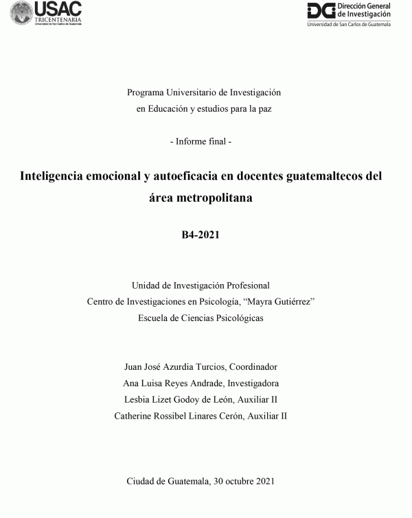 Inteligencia emocional y autoeficacia en docentes guatemaltecos del área metropolitana / Juan José Azurdia Turcios; investigadora Ana Luisa Reyes Andrade; auxiliar de investigación II Lesbia Lizet Godoy de León y Catherine Rossibel Linares Cerón; colaboradora Silvia Elizabeth Guevara Lucas.