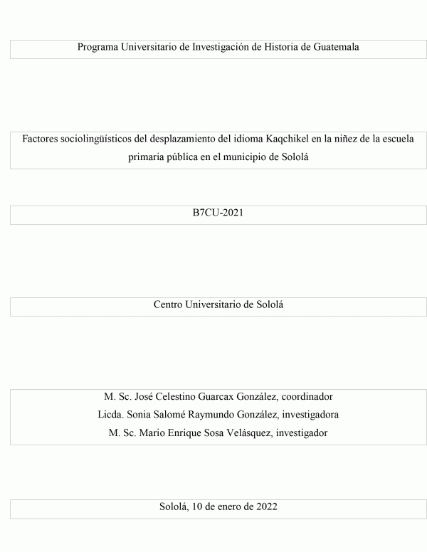 Factores sociolingüísticos del desplazamiento del idioma Kaqchikel en la niñez de la escuela primaria pública en el municipio de Sololá / José Celestino Guarcax González; investigadores Sonia Salomé Raymundo González y Mario Enrique Sosa Velásquez.