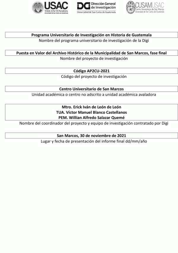 Puesta en Valor del Archivo Histórico de la Municipalidad de San Marcos, fase final / Erick Iván de León de León; auxiliares de investigación II Víctor Manuel Blanco Castellanos y Willian Alfredo Salazar Quemé.