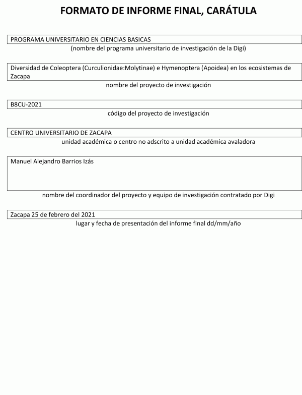 Diversidad de Coleoptera (Curculionidae:Molytinae) e Hymenoptera (Apoidea) en los ecosistemas de Zacapa / Manuel Alejandro Barrios Izás; investigadores Natalia Escobedo Kenefic y José Robledo; auxiliar de Investigación II Navil Dunyazad Ventura Sáenz; auxiliares de investigación Eduardo Cardona Valenzuela y Osbel Alfredo Mejía Coroy.