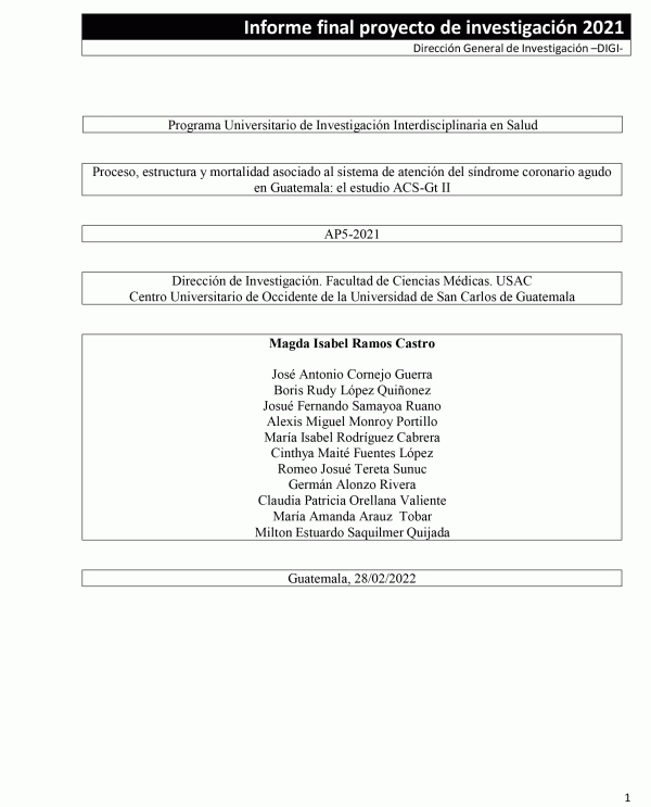Proceso, estructura y mortalidad asociado al sistema de atención del síndrome coronario agudo en Guatemala : el estudio ACS-Gt II / Magda Isabel Ramos Castro; investigadores José Antonio Cornejo Guerra, Boris Rudy López Quiñonez, Josué Fernando Samayoa Ruano, Alexis Miguel Monroy Portillo, María Isabel Rodríguez Cabrera, Cinthya Maité Fuentes López, Romeo Josué Tereta Sunuc, Germán Alonzo Rivera y Claudia Patricia Orellana Valiente; auxiliares de investigación II María Amanda Arauz Tobary Milton Estuardo Saquilmer Quijada; colaboradores Elisa María Anelu de León, Mariana Gil Salazar, Sofía Leal Wittkowksy, Juan Carlos Santis Mejía, Beatriz Amalia Paz, Kevin Oneal Flores Andrade, Roberto Antonio Pérez Reyes, Walter Eduardo Pivaral Villalta, Jenifer Paola Ramos Soto y Mario Arturo Yucuté Camey.
