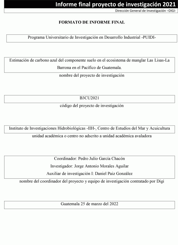 Estimación de carbono azul del componente suelo en el ecosistema de manglar Las Lisas-La Barrona en el Pacífico de Guatemala / Pedro Julio García Chacón; investigador Jorge Antonio Morales Aguilar; auxiliar de investigación I Daniel Paiz González.