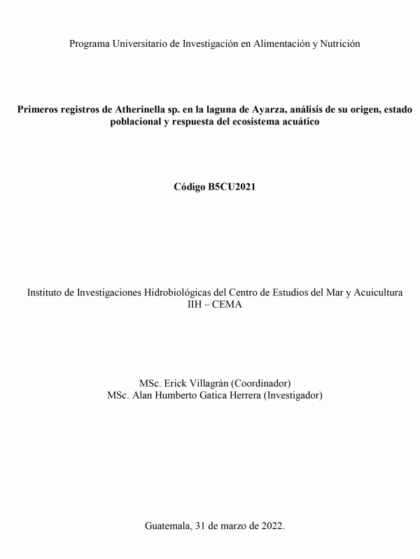Primeros registros de Atherinella sp. en la laguna de Ayarza, análisis de su origen, estado poblacional y respuesta del ecosistema acuático / Erick Villagrán; investigador Alan Humberto Gatica Herrera; colaboradores Mauricio Velásquez Meléndez y Alberto Donis.