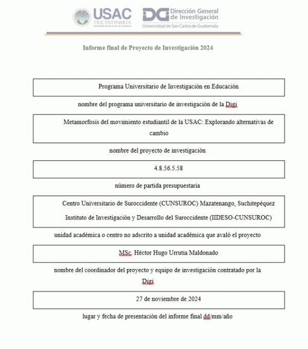El movimiento estudiantil en el Centro Universitario de Suroccidente (CUNSUROC) de la Universidad de San Carlos de Guatemala (USAC) ha experimentado transformaciones notables desde sus inicios en las décadas de 1970 y 1980. Este informe se centra en la historia y metamorfosis de la Asociación de Estudiantes Universitarios de Suroccidente (AEUSO), que en sus años de apogeo fue un baluarte en la defensa de los derechos estudiantiles y la justicia social. No obstante, desde 2007, la organización ha sufrido un marcado declive, generando un vacío en la representación y debilitando la capacidad de acción gremial. Esta investigación analiza las causas de este proceso y propone estrategias de recuperación y revitalización del movimiento estudiantil. Utilizando un enfoque cualitativo y técnicas como entrevistas y grupos focales con estudiantes, académicos y líderes, se identificaron aspectos críticos que afectan a la organización. Las recomendaciones incluyen la recuperación y organización de la AEUSO y la capacitación en historia, realidad nacional, normas universitarias, liderazgo ético, derechos humanos y organización estudiantil. También se sugiere reemplazar prácticas obsoletas por actividades inclusivas y profesionales para fortalecer la cohesión y modernizar el enfoque de la organización.