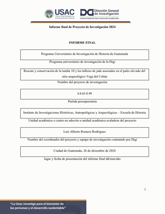 Rescate y conservación de la tumba 10 y los talleres de jade asociados en el patio elevado del sitio arqueológico Vega del Cobán / Luis Alberto Romero Rodríguez; investigador Marvin Vinicio Garcia Garcia; auxiliar de investigación II Livni Naidy Almira Zunun; colaboradores Lester Samuel Salguero, Billy Guerra y Londy Morán.