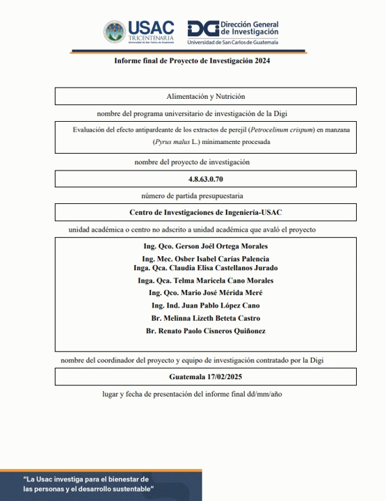 Evaluación del efecto antipardeante de los extractos de perejil (Petrocelinum crispum) en manzana (Pyrus malus L.) mínimamente procesada / Gerson Joél Ortega Morales; Osber Isabel Carías Palencia, Claudia Elisa Castellanos Jurado, Renato Paolo Cisneros Quiñonez y Melinna Lizeth Beteta Castro; colaborador Juan Pablo López Cano.