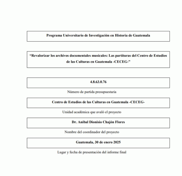 Revalorizar los archivos documentales musicales : las partituras del Centro de Estudios de las Culturas en Guatemala -CECEG- / Aníbal Dionisio Chajón Flores; auxiliares de investigación Ericka Rebeca Izquierdo Morales, Silvia Patricia Pérez González, Mónica Anaí Monroy Mateo, María Gabriela Samayoa Flores y Héctor Rodolfo Gómez Oliva; colaboradora Ana Cecilia Flores.