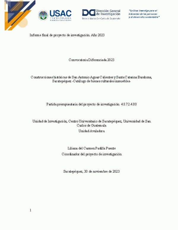 Recursos en línea: Resumen: El departamento de Sacatepéquez es conocido a nivel nacional e internacional por su vasto acervo patrimonial, inmerso en un contexto geográfico e histórico que suscita interés común para su conocimiento y visitación. Alrededor de la Antigua Guatemala se encuentra una gran cantidad de bienes culturales que permanecen dentro una sociedad creciente y cambiante, sin normativas claras que garanticen su preservación y puesta en valor como recurso local de desarrollo sostenible en sus respectivas localidades. El primer paso para la puesta en valor, conservación y gestión del patrimonio material es su identificación. La propuesta de elaboración de un inventario de bienes culturales históricos en los municipios de San Antonio Aguas Calientes y Santa Catarina Barahona del departamento de Sacatepéquez, que conforman la muestra seleccionada para la presente investigación, tiene la finalidad de esbozar un catálogo de construcciones históricas que evidencie los rasgos distintivos locales en un compendio, y las recomendaciones técnicas pertinentes de preservación para las futuras generaciones. El desarrollo de este estudio define la base para la conformación de nuevas propuestas que va desde la ampliación de la muestra hasta el planteamiento de proyectos de gestión que consideren el recurso material histórico dentro de los planes y programas educativos, económicos y sociales para las comunidades depositarias.Resumen: The department of Sacatepéquez is known nationally and internationally for its vast heritage collection, immersed in a geographical and historical context that arouses common interest for its knowledge and visitation. Around Antigua Guatemala there is a large amount of cultural assets that remain within a growing and changing society, without clear regulations that guarantee their preservation and enhancement as a local resource, for sustainable development in their respective localities. The first step in valuing, preserving and managing material heritage is its identification. The proposal to prepare an inventory of historical and cultural assets in the municipalities of San Antonio Aguas Calientes and Santa Catarina Barahona in Sacatepéquez department, which make up the sample selected for this research, has the purpose of outlining a catalog of historical constructions that evidence local distinctive features in a compendium, and relevant technical preservation recommendations for future generations. The development of this study defines the basis for the formation of new proposals that range from expanding the sample to the formulation of management projects that consider the historical material resource within the educational, economic and social plans and programs for the depository communities.