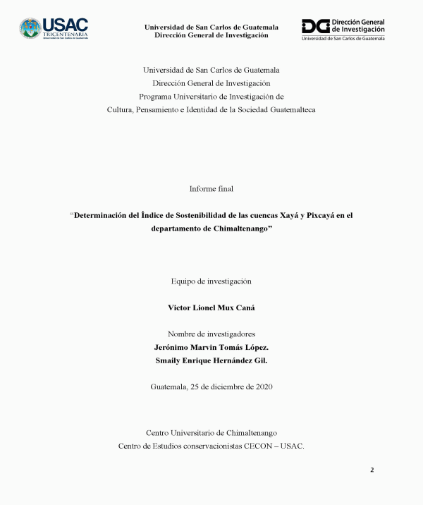 Determinación del Índice de Sostenibilidad de las cuencas Xayá y Pixcayá en el departamento de Chimaltenango / Victor Lionel Mux Caná; investigadores Jerónimo Marvin Tomás López y Smaily Enrique Hernández Gil.