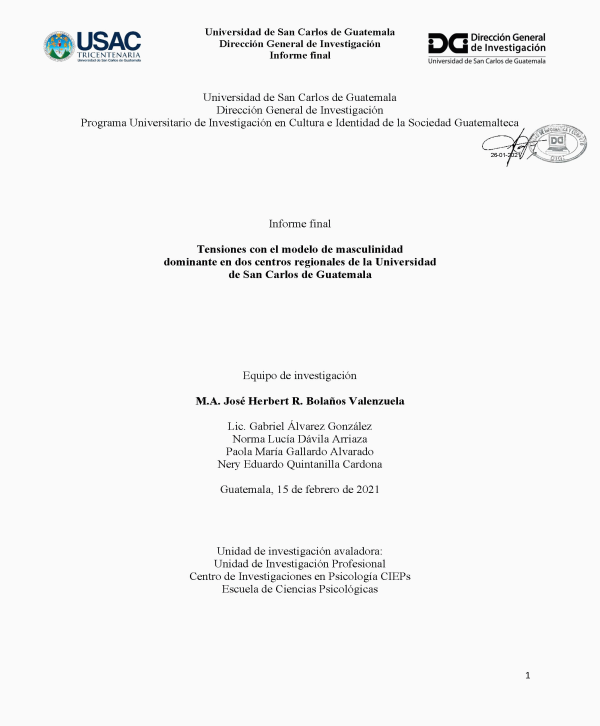 Tensiones con el modelo de masculinidad dominante en dos centros regionales de la Universidad de San Carlos de Guatemala / José Herbert R. Bolaños Valenzuela; investigador Gabriel Álvarez González; auxiliar de investigación II Norma Lucía Dávila Arriaza; auxiliar de investigación I Paola María Gallardo Alvarado; auxiliar de investigación I Nery Eduardo Quintanilla Cardona; investigadora colaboradora María Alejandra Muralles Marín.