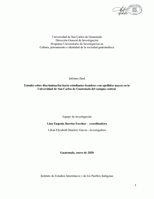 Estudio sobre discriminación hacia estudiantes hombres con apellidos mayas en la Universidad de San Carlos de Guatemala del campus central / Lina Eugenia Barrios Escobar; investigadora Lilian Elizabeth Ramírez García.