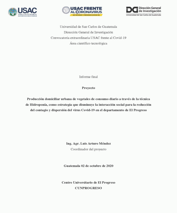 Producción domiciliar urbana de vegetales de consumo diario a través de la técnica de Hidroponía, como estrategia que disminuye la interacción social para la reducción del contagio y dispersión del virus Covid-19 en el departamento de El Progreso / Luis Arturo Méndez.