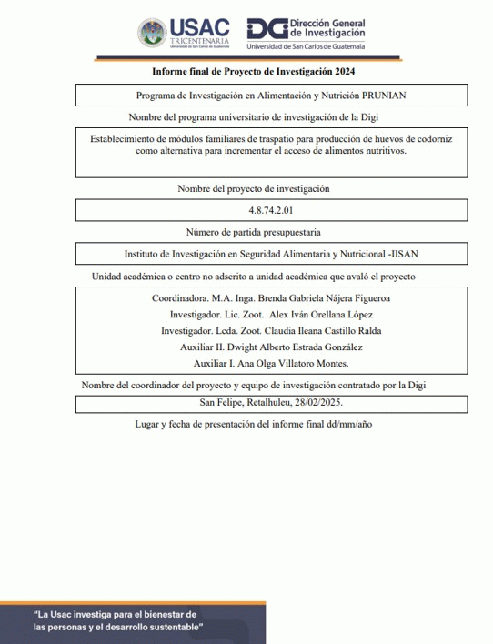 Establecimiento de módulos familiares de traspatio para producción de huevos de codorniz como alternativa para incrementar el acceso de alimentos nutritivos / Brenda Gabriela Nájera Figueroa; investigadores Alex Iván Orellana López y Claudia Ileana Castillo Ralda ; auxiliar de investigación II Dwight Alberto Estrada González ; auxiliar de investigación I Ana Olga Villatoro Montes.
