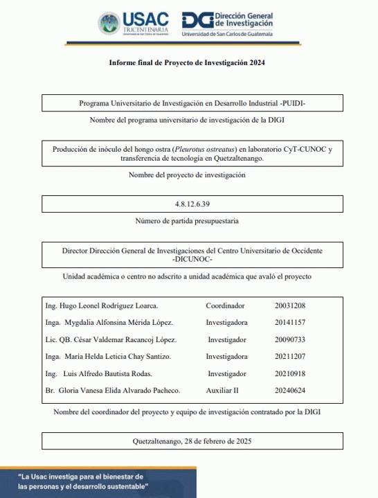 Producción de inóculo del hongo ostra (Pleurotus ostreatus) en laboratorio CyT-CUNOC y transferencia de tecnología en Quetzaltenango / Hugo Leonel Rodríguez Loarca; investigadores Mygdalia Alfonsina Mérida López ; César Valdemar Racancoj López ; María Helda Leticia Chay Santizo ; Luis Alfredo Bautista Rodas ; auxiliar de investigación II Gloria Vanesa Elida Alvarado Pacheco.