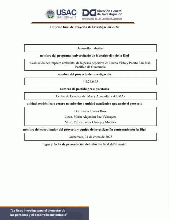 Evaluación del impacto ambiental de la pesca deportiva en Buena Vista y Puerto San José, Pacífico de Guatemala / Juana Lorena Boix; autores Carlos Javier Chicojay Morales y María Alejandra Paz Velásquez; colaboradores Juan Manuel Cobar y Yuri Carranza.