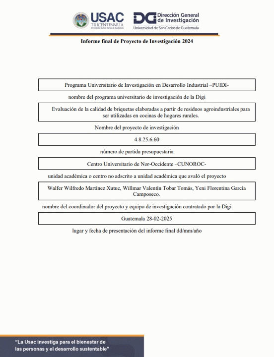 Evaluación de la calidad de briquetas elaboradas a partir de residuos agroindustriales para ser utilizadas en cocinas de hogares rurales / Walfer Wilfredo Martínez Xutuc; autores Willmar Valentín Tobar Tomás y Yeni Florentina García; colaboradores Mariela del Rosario Tello Hernández y Mynor Eduardo Tello Hernández.