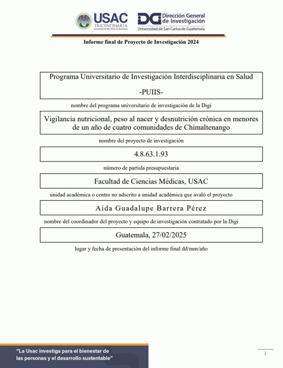 Vigilancia nutricional, peso al nacer y desnutrición crónica en menores de un año de cuatro comunidades de Chimaltenango / Aída Guadalupe Barrera Pérez; investigadores Magda Francisca Velásquez Tohom, Dorian Edilzar Ramírez Flores, David Arturo Pineda Argueta yCarmen María Enríquez Guzmán; auxiliares de investigación II Katheryne Andrea Ruiz López y Amanda Izabel Meléndez Castro.