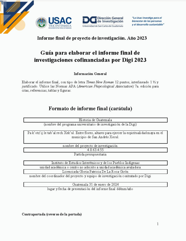 Pa k’otz’ij le tab’al rech Xek’ul. Entre flores, altares para ejercer la espiritualidad maya en el municipio de San Andrés Xecul / Gloria Patricia De La Roca Girón; investigadora Lina Eugenia Barrios Escobar; auxiliares de investigación I, Isabel Yohana Hernández Santay y Edwin Ismael Cosinero Chan.