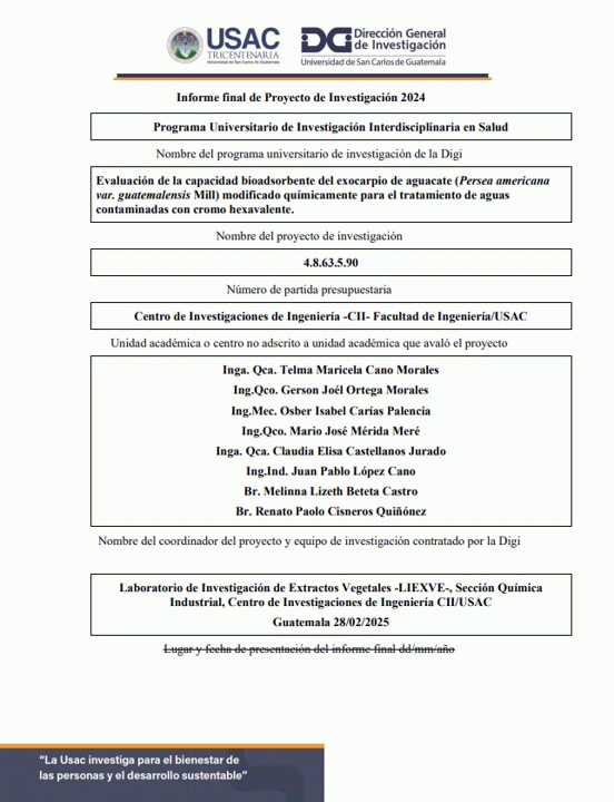Evaluación de la capacidad bioadsorbente del exocarpio de aguacate (Persea americana var. guatemalensis Mill) modificado químicamente para el tratamiento de aguas contaminadas con cromo hexavalente / Telma Maricela Cano Morales; investigadores Gerson Joél Ortega Morales, Osber Isabel Carías Palencia, Mario José Mérida Meré, Claudia Elisa Castellanos Jurado y Juan Pablo López Cano; auxiliar de Investigación II Melinna Lizeth Beteta Castro y Renato Paolo Cisneros Quiñónez.
