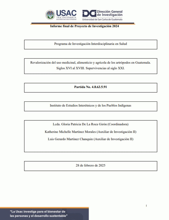 Revalorización del uso medicinal, alimenticio y agrícola de los artrópodos en Guatemala. Siglos XVI al XVIII. Supervivencias al siglo XXI / Gloria Patricia De La Roca Girón; auxiliares de investigación II Katherine Michelle Martínez Morales y Luis Gerardo Martínez Chanquin.