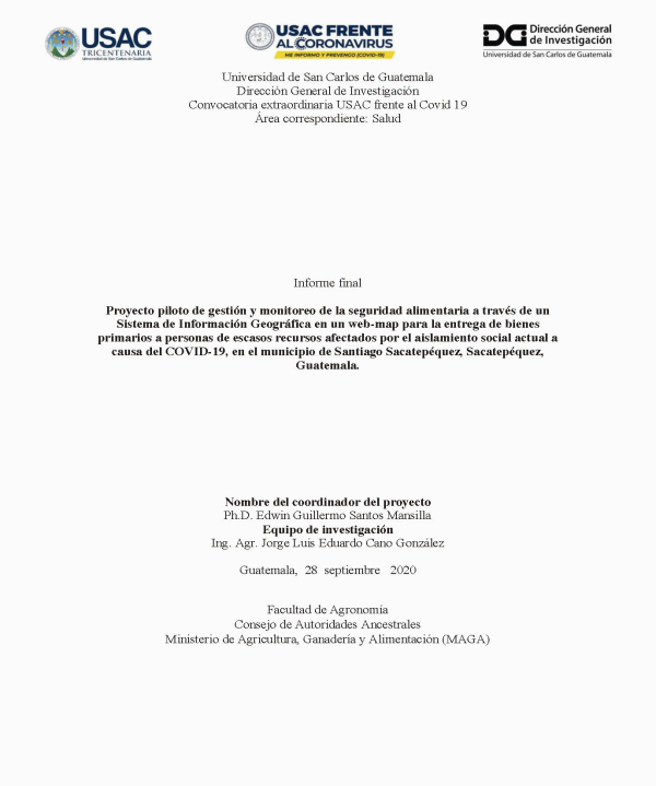 Proyecto piloto de gestión y monitoreo de la seguridad alimentaria a través de un Sistema de Información Geográfica en un web-map para la entrega de bienes primarios a personas de escasos recursos afectados por el aislamiento social actual a causa del COVID-19, en el municipio de Santiago Sacatepéquez, Sacatepéquez, Guatemala / Edwin Guillermo Santos Mansilla; colaboradores Jorge Luis Eduardo Cano González y Eddy Aspuac