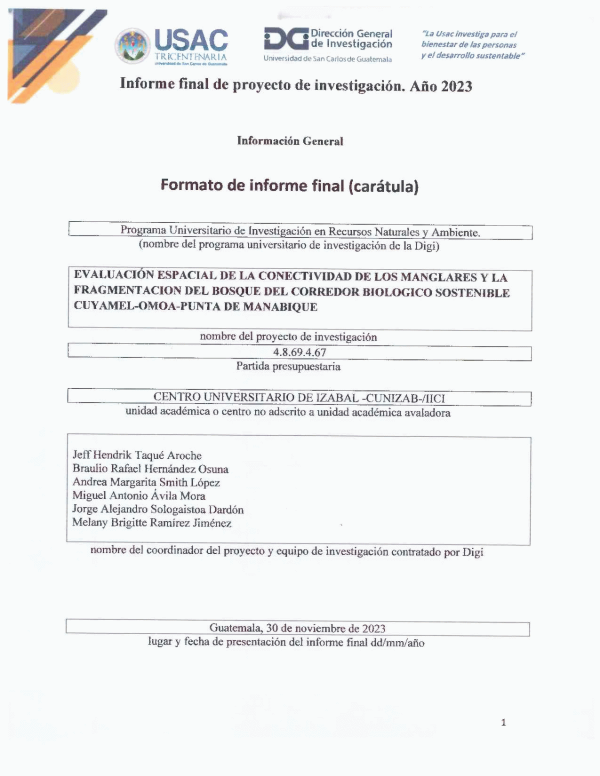 Evaluación espacial de la conectividad de los manglares y la fragmentación del bosque del corredor biológico sostenible Cuyamel-Omoa-Punta de Manabique / Jeff Hendrik Taqué Aroche; investigadores Braulio Rafael Hernández Osuna, Andrea Margarita Smith López, Miguel Antonio Ávila Mora y Jorge Alejandro Sologaistoa Dardón; auxiliar de investigación II Melany Brigitte Ramírez Jiménez.