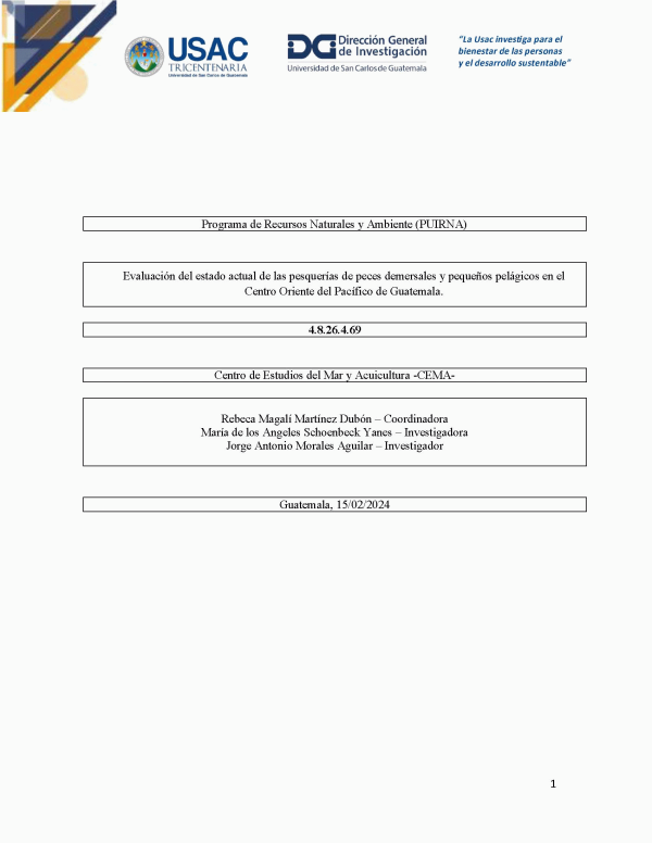 Evaluación del estado actual de las pesquerías de peces demersales y pequeños pelágicos en el Centro Oriente del Pacífico de Guatemala / Rebeca Magalí Martínez Dubón; investigadores María de los Angeles Schoenbeck Yanes y Jorge Antonio Morales Aguilar.