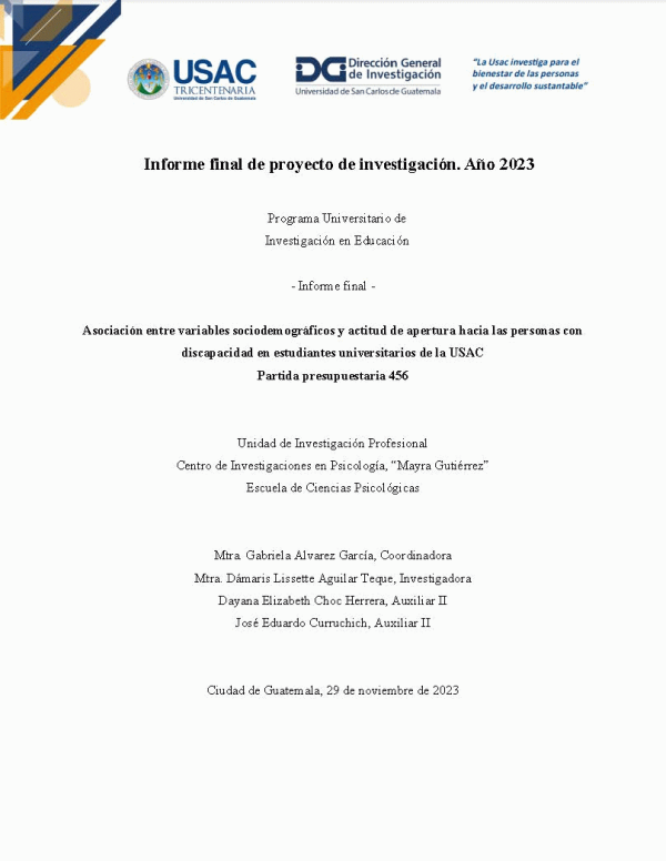 Asociación entre variables sociodemográficos y actitud de apertura hacia las personas con discapacidad en estudiantes universitarios de la USAC / Gabriela Alvarez García; investigadora Dámaris Lissette Aguilar Teque; auxiliares de investigación II Dayana Elizabeth Choc Herrera y José Eduardo Currichich.
