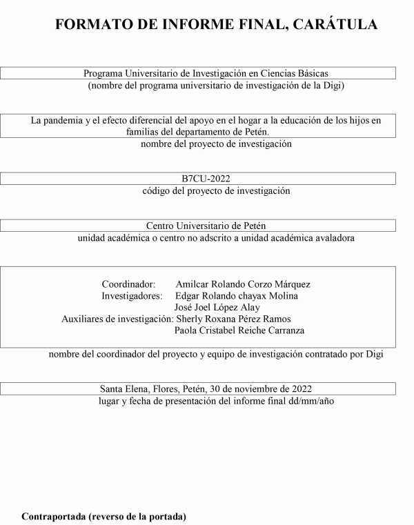 La pandemia y el efecto diferencial del apoyo en el hogar a la educación de los hijos en familias del departamento de Petén / Amilcar Rolando Corzo Márquez; investigadores Edgar Rolando Chayax Molina y José Joel López Alay; auxiliares de investigación Sherly Pérez Ramos, Roxana y Paola Cristabel Reiche Carranza.