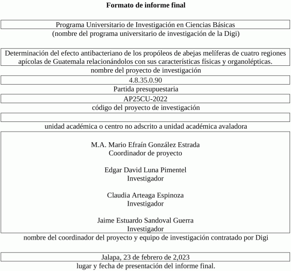 Determinación del efecto antibacteriano de los propóleos de abejas melíferas de cuatro regiones apícolas de Guatemala relacionándolos con sus características físicas y organolépticas / Mario EfraínGonzález Estrada; investigadores Edgar David Luna Pimentel, Claudia Arteaga Espinoza y Jaime Estuardo Sandoval Guerra.