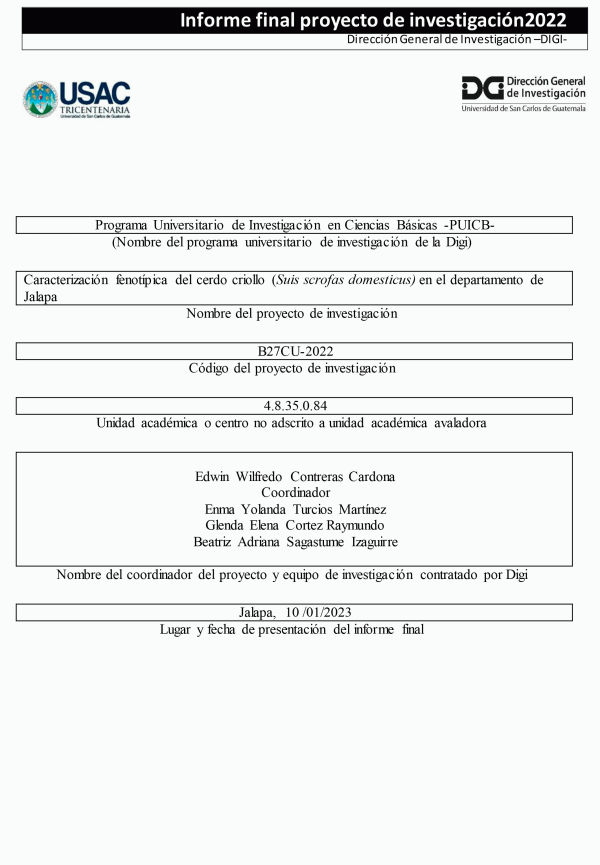 Caracterización fenotípica del cerdo criollo (Suis scrofas domesticus) en le departamento de Jalapa / Edwin Wilfredo Contreras Cardona; investigadoras Enma Yolanda Turcios Martínez y Glenda Elena Cortez Raymundo; auxiliar de investigación II Beatriz Adriana Sagastume Izaguirre.