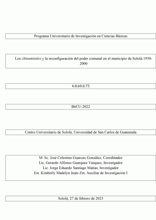 Los chinamitales y la reconfiguración del poder comunal en el municipio de Sololá : 1950-2000 / José Celestino Guarcax González; investigadores Gerardo Alfonso Guarquez Vásquez y Jorge Eduardo Santiago Matías; auxiliar de investigación I Kimberly Madelyn Jeatz Zet.
