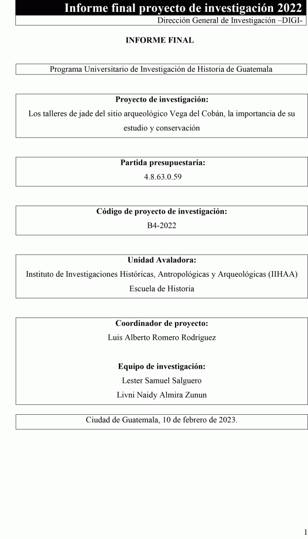 Los talleres de jade del sitio arqueológico Vega del Cobán, la importancia de su estudio y conservación / Luis Alberto Romero Rodríguez; auxiliares de investigación II Lester Samuel Salguero y Livni Naidy Almira Zunun.