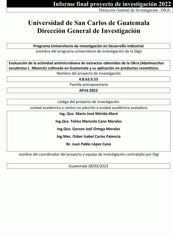 Evaluación de la actividad antimicrobiana de extractos obtenidos de la Okra (Abelmoschus esculentus L. Moench) cultivada en Guatemala y su aplicación en productos cosméticos / Mario José Mérida Meré; investigadores Telma Maricela Cano Morales, Gerson Joél Ortega Morales y Osber Isabel Carías Palencia; auxiliar de investigación II Juan Pablo López Cano.