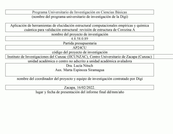 Aplicación de herramientas de elucidación estructural computacionales empíricas y química cuántica para validación estructural : revisión de estructura de Corozina A / LucíaNitsch-Velásquez; autora, Marta Espinoza Siramagua.