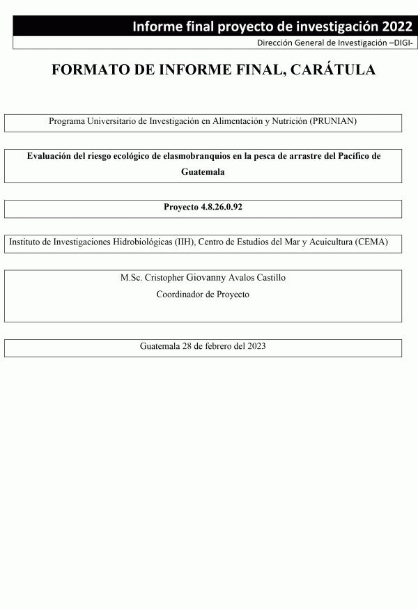 Evaluación del riesgo ecológico de elasmobranquios en la pesca de arrastre del Pacífico de Guatemala / Cristopher Giovanny Avalos Castillo; investigadores José Roberto Ortíz y Francisco Emanuel Polanco Vásquez.