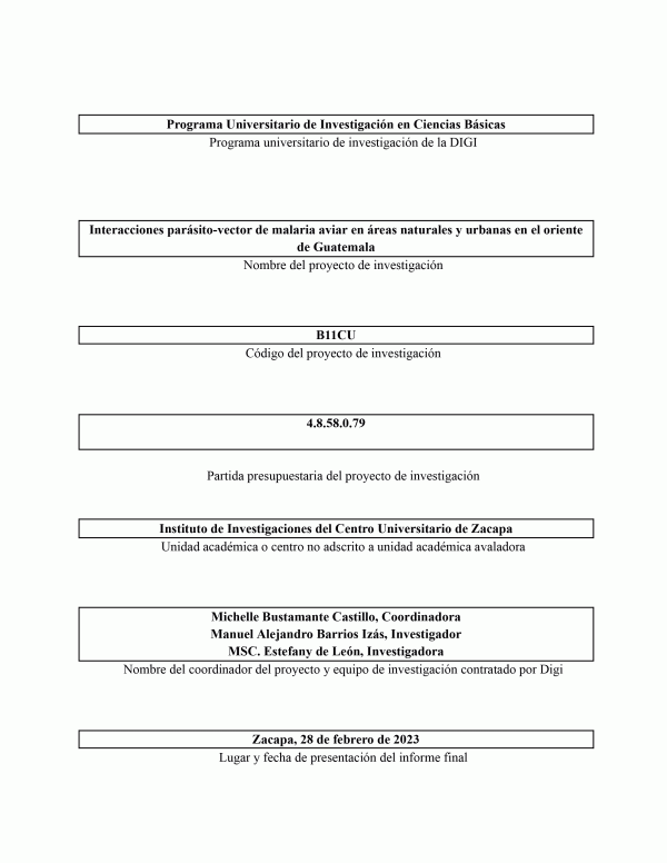 Interacciones parásito-vector de malaria aviar en áreas naturales y urbanas en el oriente de Guatemala / Michelle Bustamante Castillo; investigadores Manuel Alejandro Barrios Izás y Estefany de León.