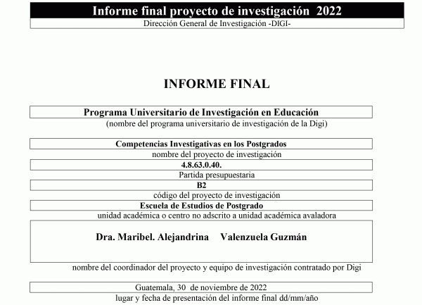 TextoEditor: Guatemala : Universidad de San Carlos de Guatemala, Dirección General de Investigación, Programa Universitario de Investigación en Educación, Facultad de Humanidade, Escuela de Estudios de Postgrado, 2022Descripción: 78 páginas : ilustraciones (algunas en color) ; 27 cmTipo de contenido: - texto